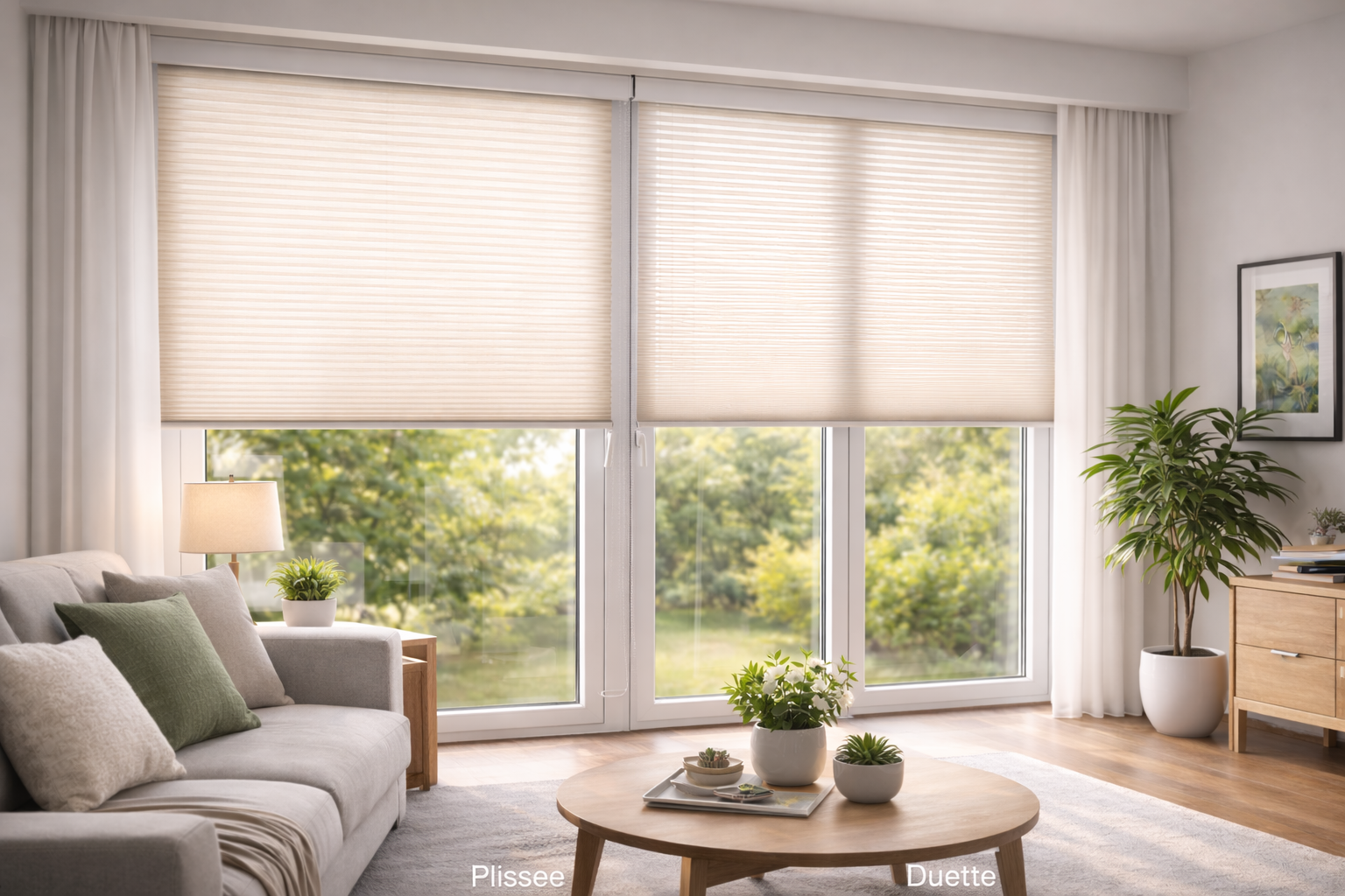 Maßgefertigte Plissees und Duette® bieten flexiblen Sichtschutz und sorgen für ein angenehmes Raumgefühl.
